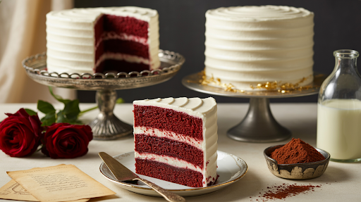 It’s in-between: red velvet typically has a light cocoa note (less than chocolate cake) with a soft, tender crumb and a subtle tang from buttermilk.